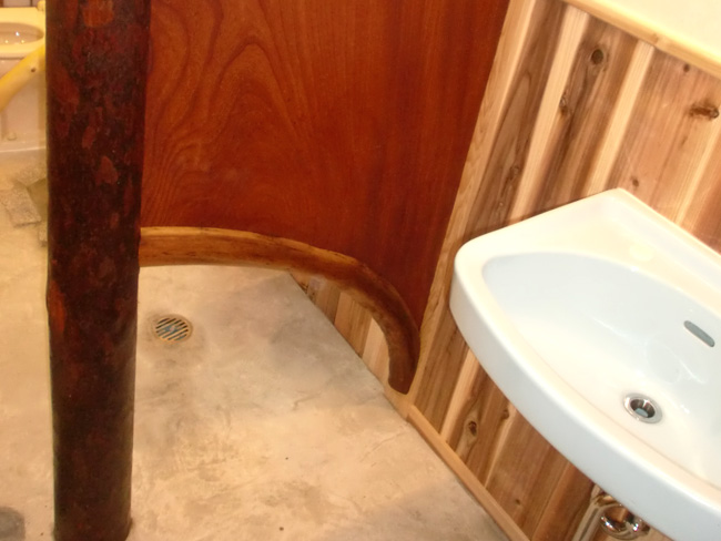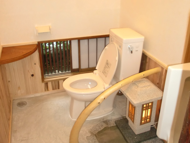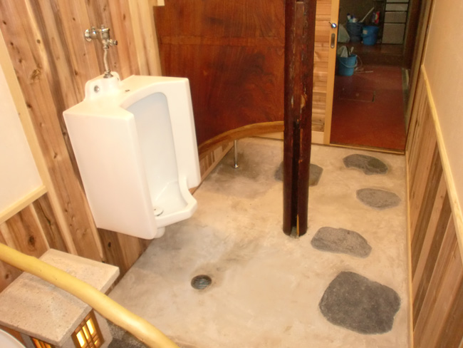 銘木を利用しオリジナルで男性トイレの目隠しや、手すりを取り付けました。