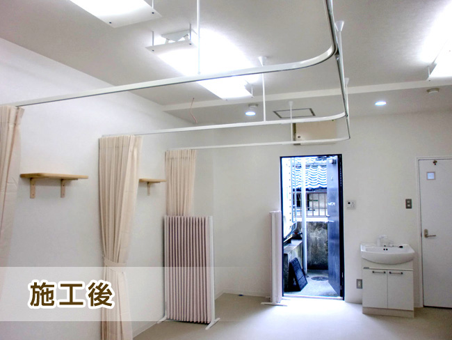 店舗改装の際に今の電気のままでは、施術中患者様がまぶしいと思うと院長様よりご相談を頂きました。できるだけコストを押さえ、まぶしさも軽減したいというご要望を元に、西尾工務店オリジナル電飾カバーを作りました。電気とカバーの間に埃がたまりやすい為掃除が大変という弱点はありますが、その分コストを押さえることもでき、まぶしさも軽減するという2つの問題を解決することができ、院長様にも大変喜んで頂きました。